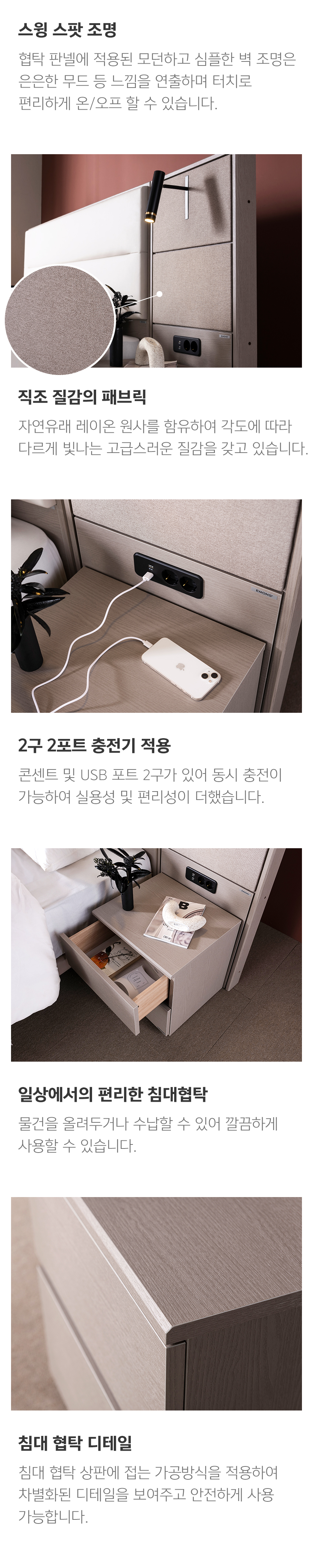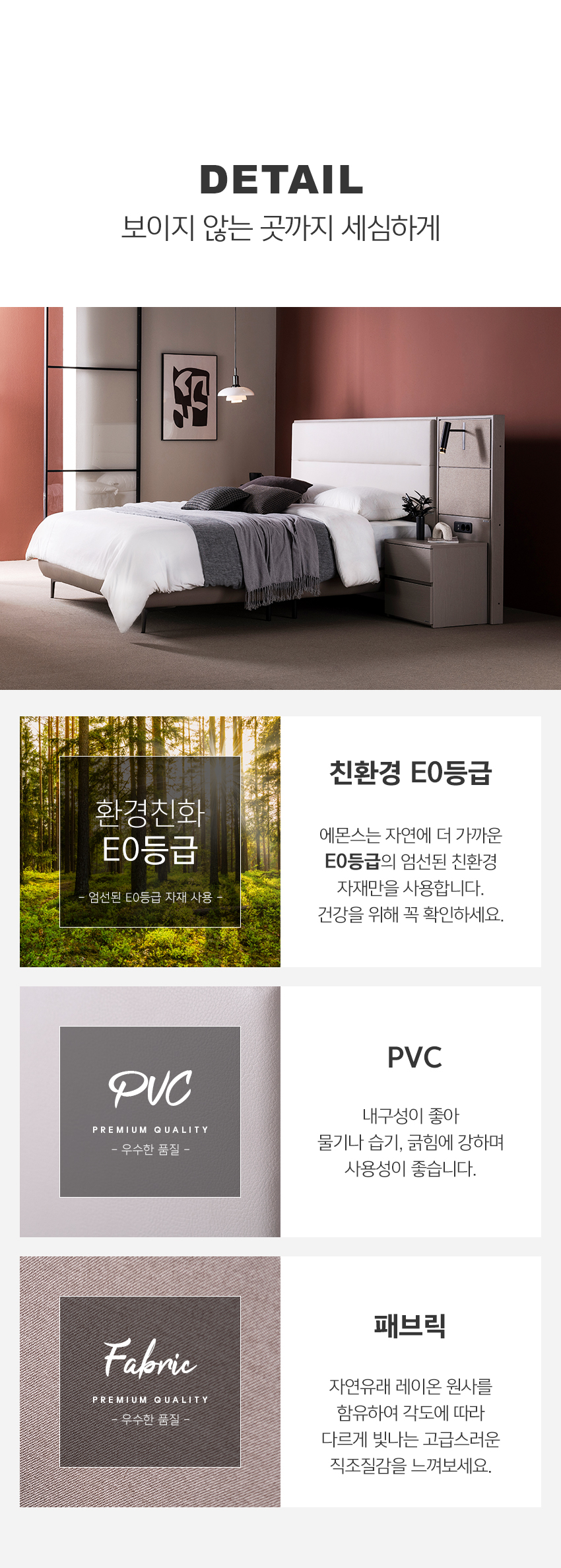 PB, MDF, 시트오버레이, ABS엣지 PVC가죽, 패브릭, 판넬벽조명, 콘센트(USB포함)