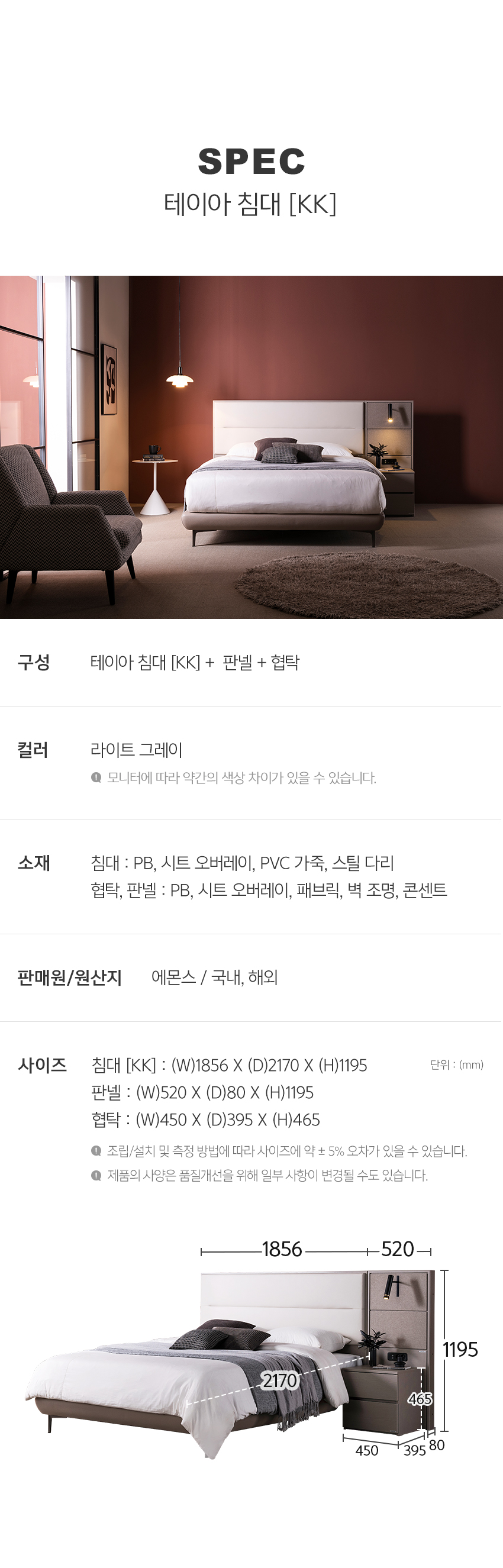 침대 : 1656 x 2100 x 1195침대 협탁 판넬 : 520 x 80 x 1195침대 협탁 : 450 x 395 x 465