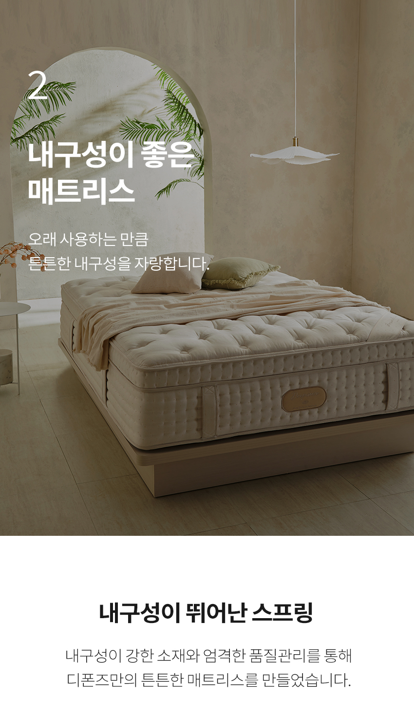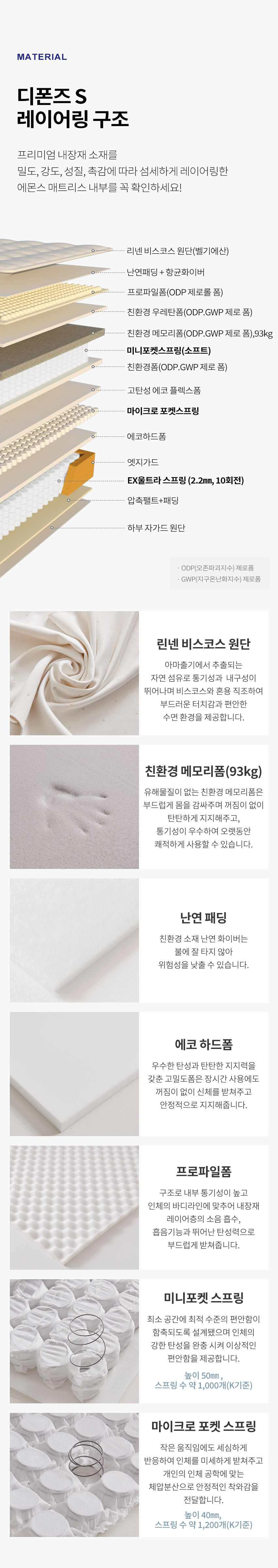 내장재 : 난연패딩+항균화이버, 프로파일폼, 미니포켓스프링(소프트), 친환경 제로폼(GWP. ODP 제로),고탄성 에코플렉스폼 ,마이크로포켓스프링 ,에코하드폼, EX울트라 스프링(2.2㎜, 10회전)