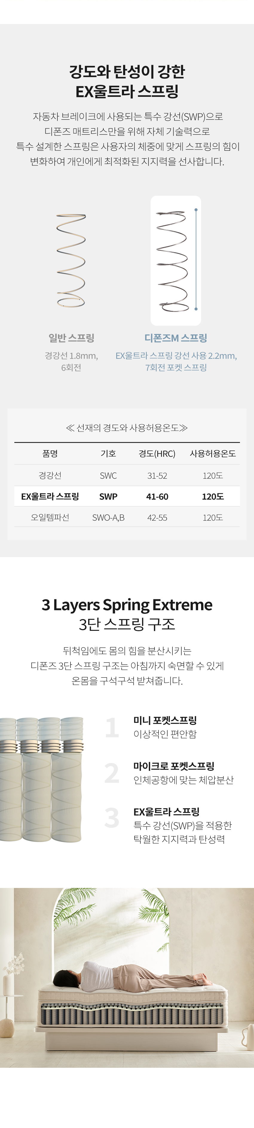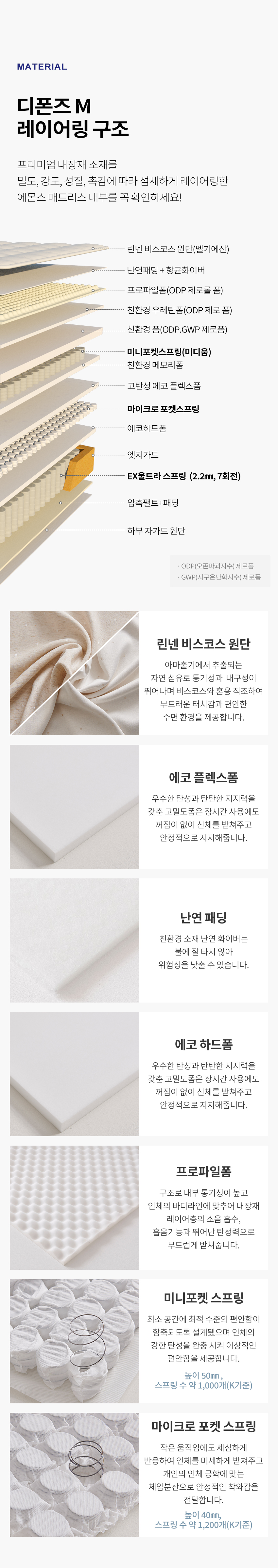내장재 : 난연패딩+항균화이버, 프로파일폼, 미니포켓스프링(미디움), 친환경 제로폼(GWP. ODP 제로),친환경 메모리폼 ,마이크로포켓스프링 ,에코하드폼, EX울트라 스프링(2.2㎜, 7회전)