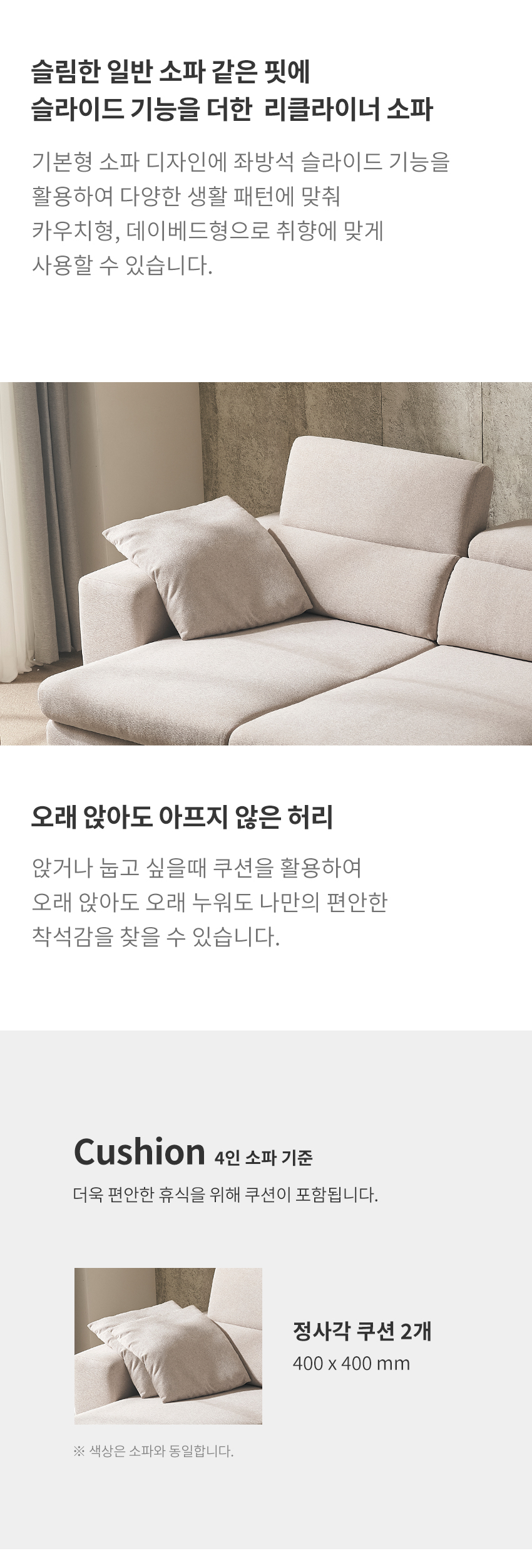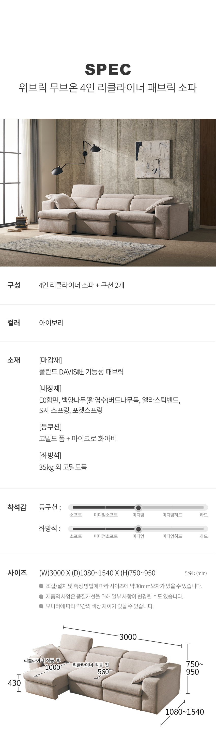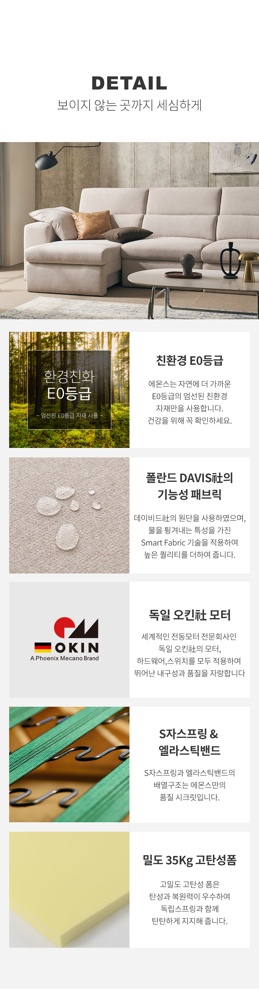 [마감재]폴란드 DAVIS社 기능성 패브릭[내장재]E0합판, 백양나무(활엽수)버드나무목, 엘라스틱밴드,S자 스프링, 포켓스프링[등쿠션]고밀도 폼 + 마이크로 화아버[좌방석]35kg 외 고밀도폼