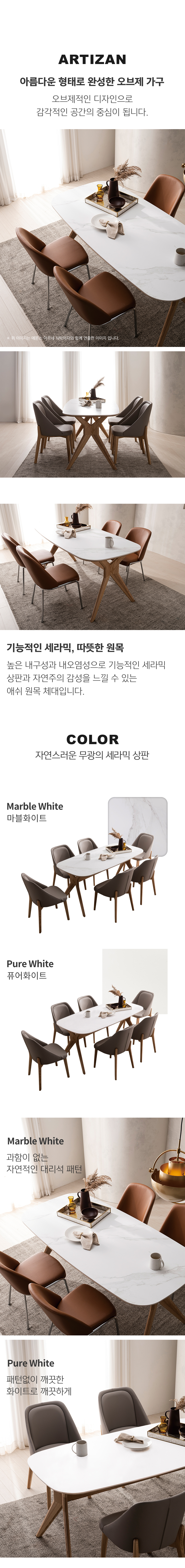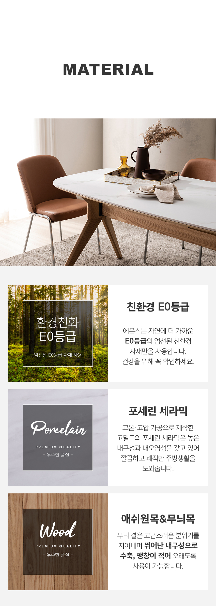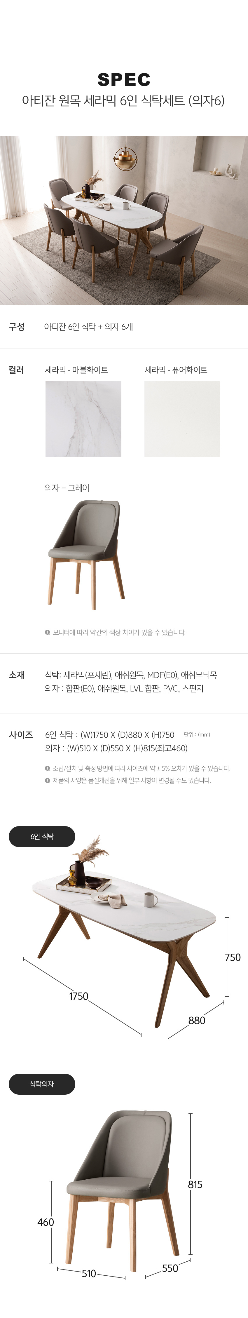 식탁 : 세라믹(포세린), 애쉬원목, MDF(E0), 애쉬무늬목의자 : 합판(E0), 애쉬원목, LVL 합판, PVC, 스펀지