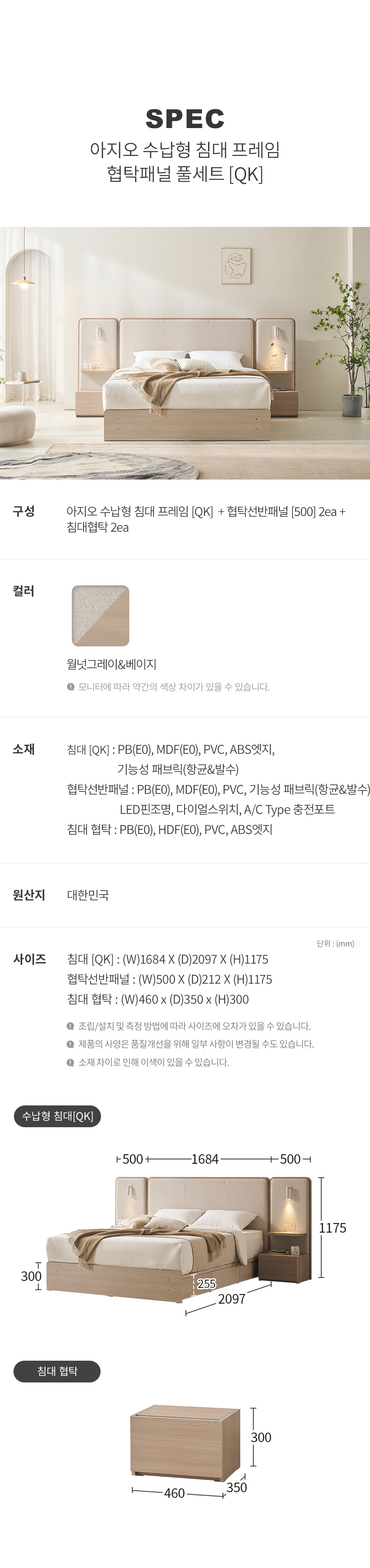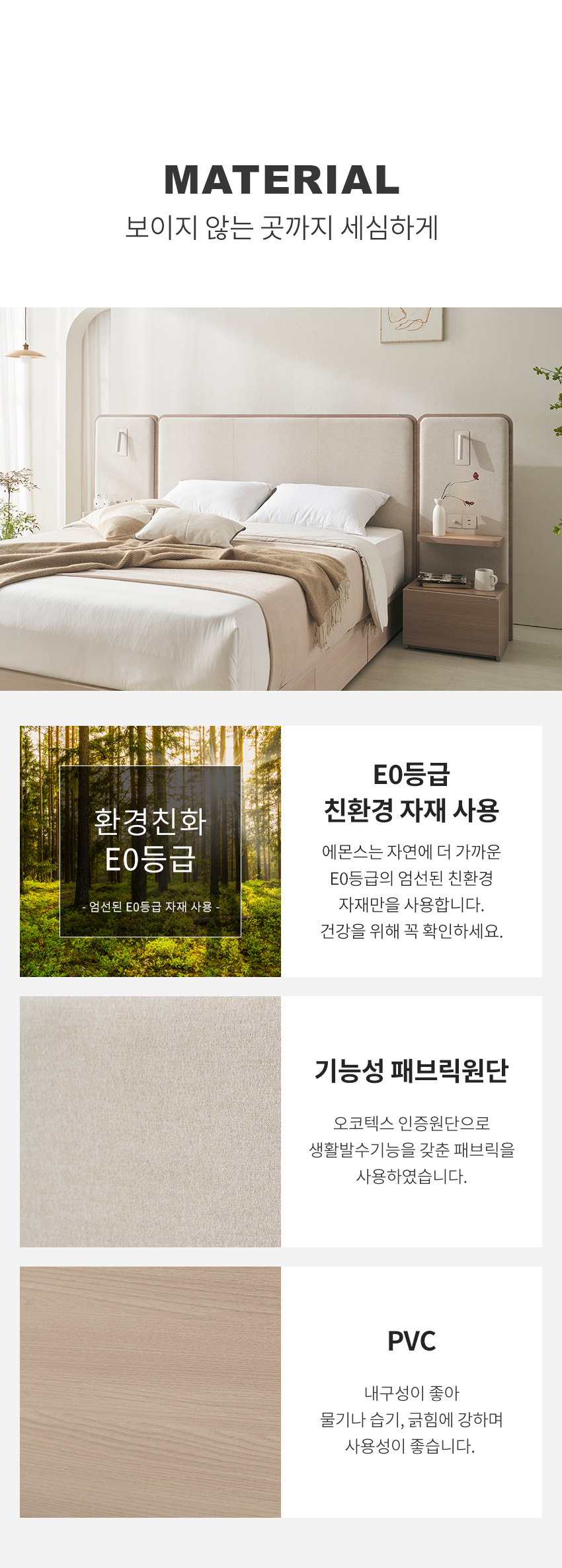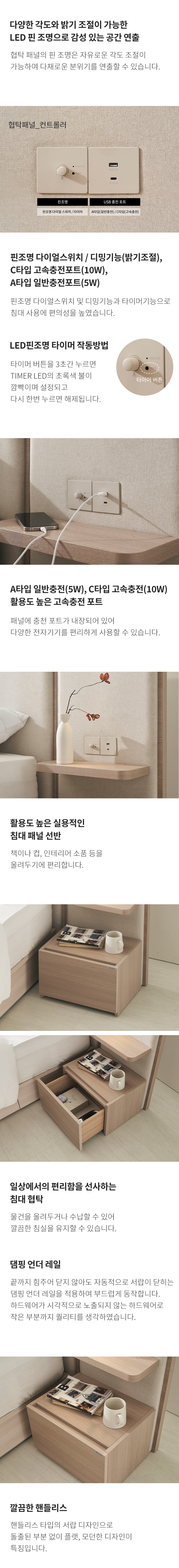 협탁선반패널 : PB(E0), MDF(E0), PVC, ABS엣지, 기능성 패브릭(항균&발수), LED핀조명, 다이얼스위치, A/C Type 충전포트