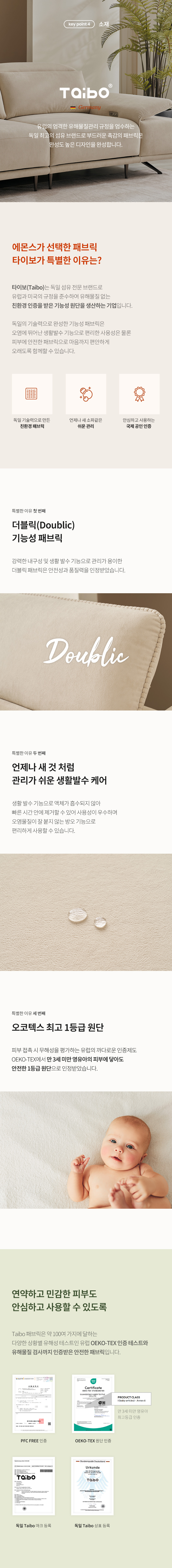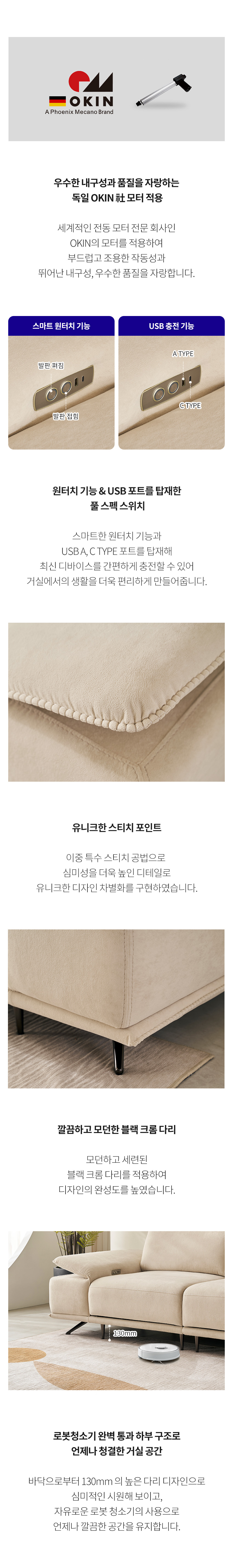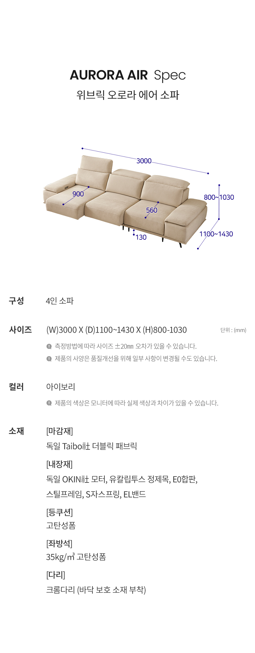 [마감재]독일 Taibo社 더블릭 패브릭[내장재]독일 OKIN社 모터, E0합판, 스틸프레임, 유칼립투스 정제목, 엘라스틱밴드, S자 스프링[등쿠션]고탄성폼[좌방석]35kg/㎥ 고탄성폼